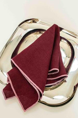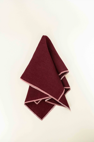 Linen dinner napkins in Bordeaux & Blush, handmade by Laura Rees from 100% linen. Featuring a deep bordeaux-toned body with a soft blush accent edge, this set adds warmth, contrast, and a quietly playful touch to the table.