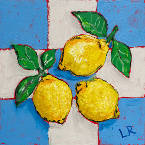 Three vibrant lemons rest on a checkered cloth, painted with lively texture. Lemons & Linen is a bright pop of colour that brings warmth and freshness to any space.